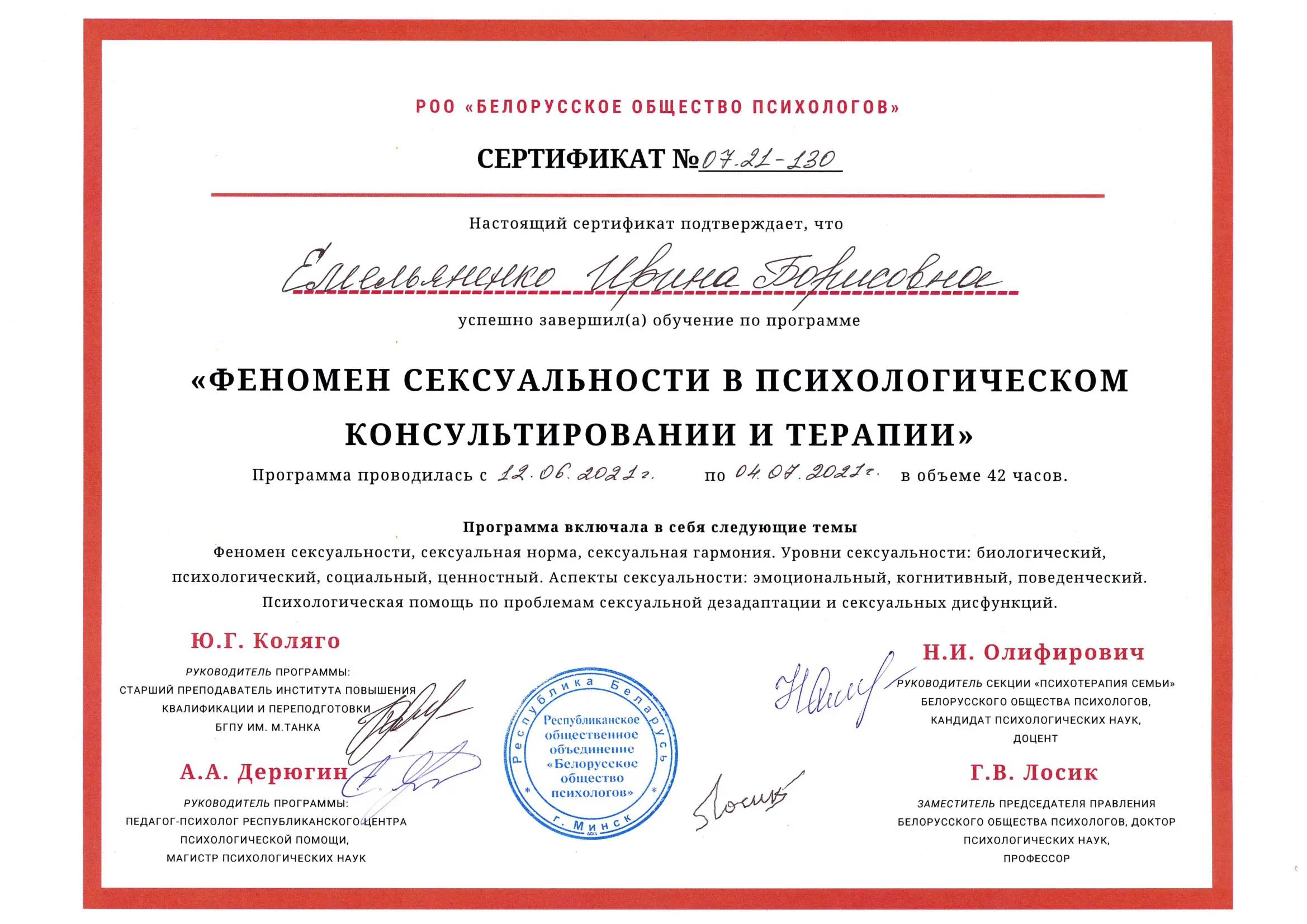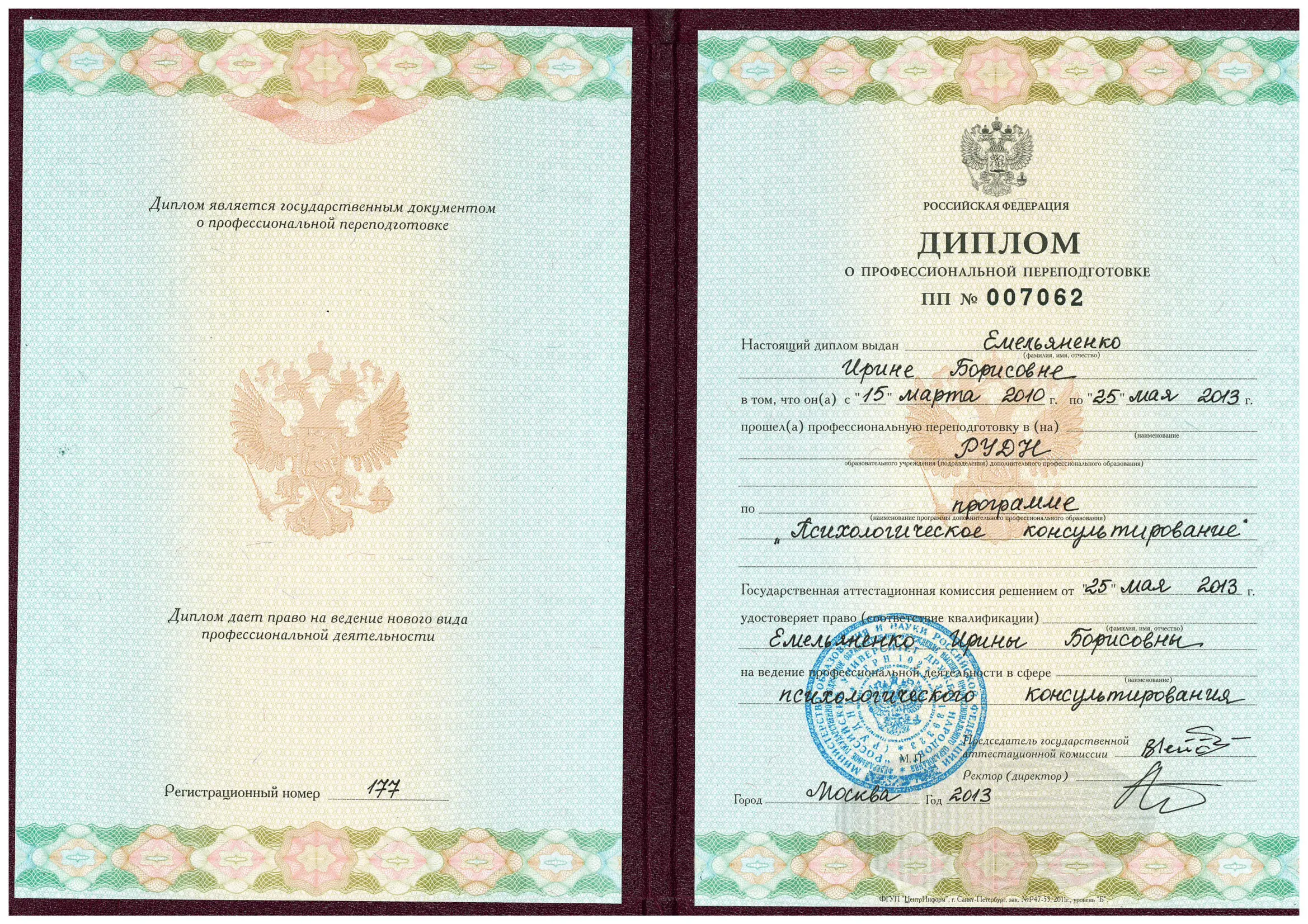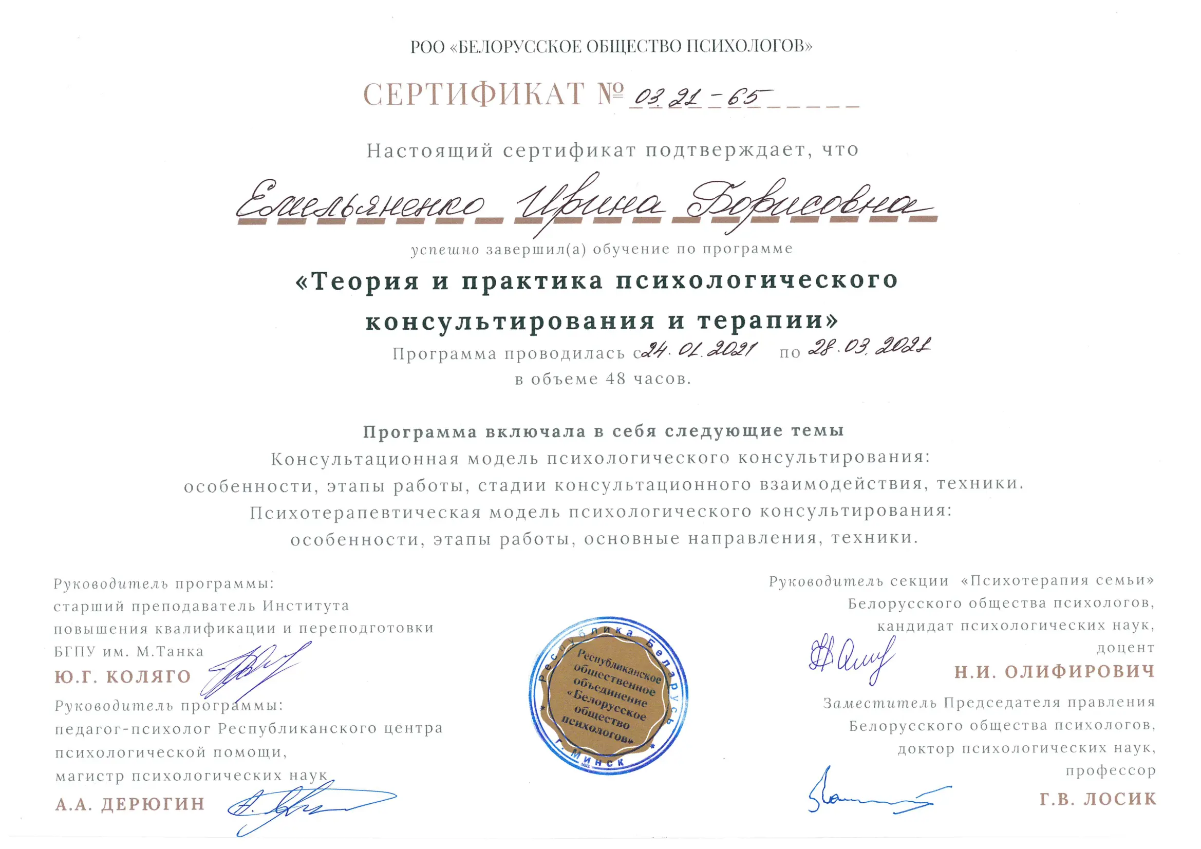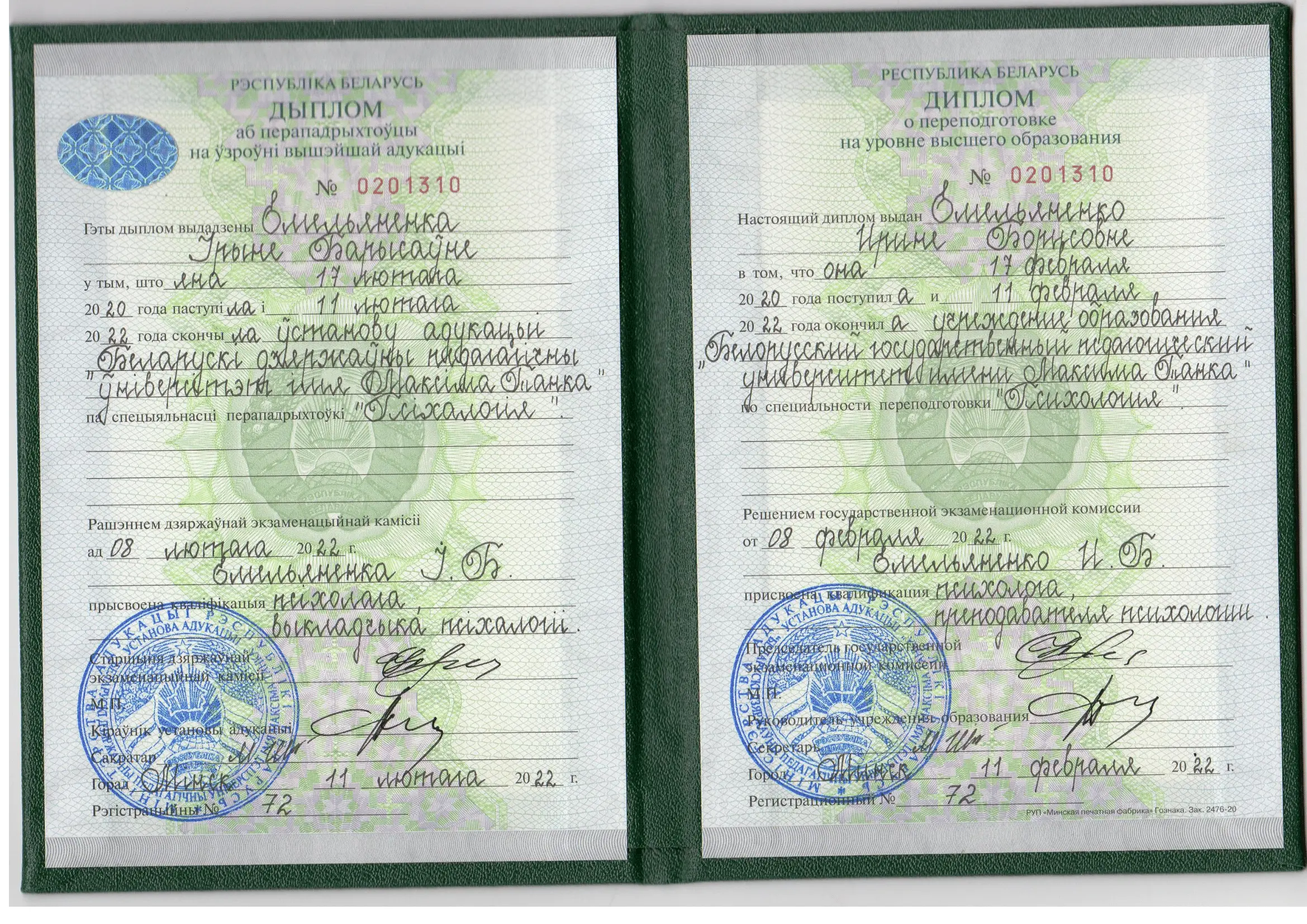 Я окончила Российский Университет Дружбы Народов по специальности Психологическое консультирование, прошла переподготовку в Белорусском государственном педагогическом университете имени Максима Танка по специальности Психология. Регулярно посещаю множество дополнительных курсов и тренингов по специализированным направлениям психотерапии и коучинга, что позволяет мне быть в курсе последних достижений в области психологии.